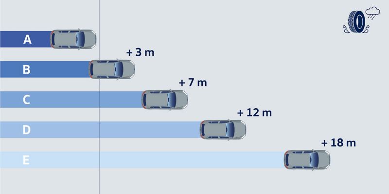 La classe d'adhérence sur sol mouillé fournit des informations sur les propriétés de freinage par temps de pluie et va de A (sécurité maximale) à E (sécurité minimale).